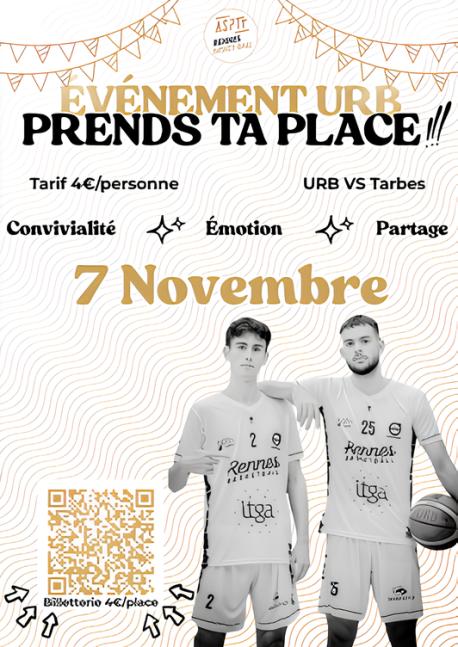 Réservation en ligne via le lien : https://www.helloasso.com/associations/asptt-rennes-basket/evenements/places-urb-x-tarbes